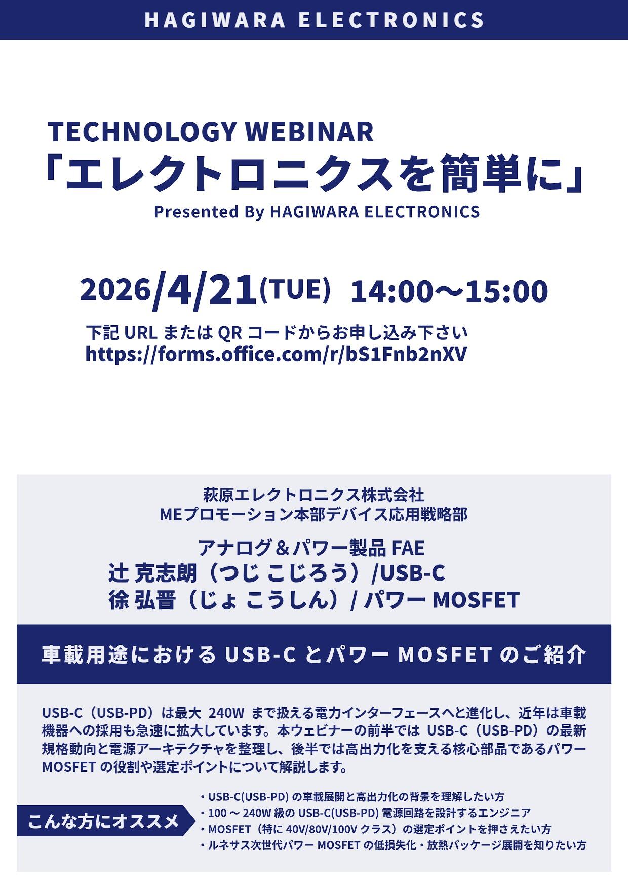 4月21日(火)萩原エレクトロニクス ウェビナー「車載用途のおけるUSB-CとパワーMOSFETのご紹介」を開催