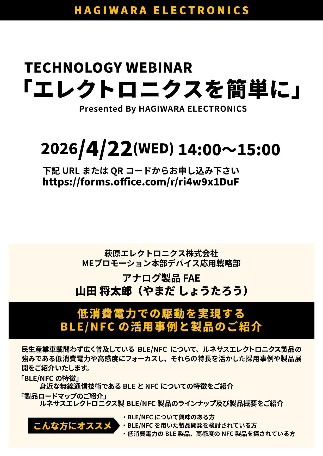 4月22日(水)萩原エレクトロニクス ウェビナー「BLE/NFCの活用事例と製品のご紹介」を開催