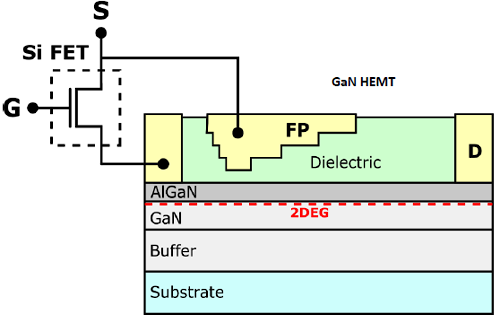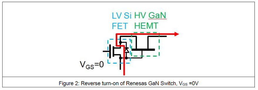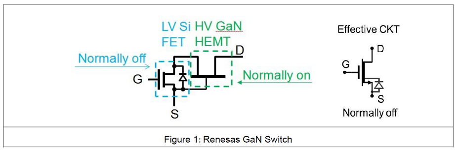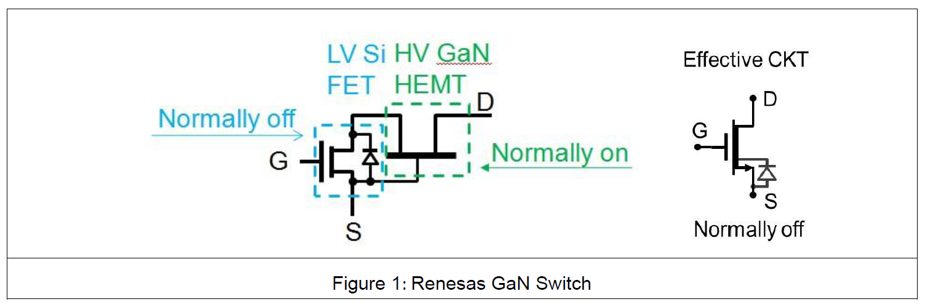 ルネサスのGaN(窒化ガリウム)パワースイッチは、低耐圧のSi MOSFETと高耐圧のGaN HEMT(ノーマルオン)をカスコード構成で組み合わせたものです。(Figure 1)
