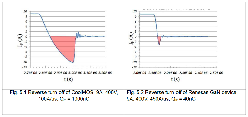 下図左側がCoolMOS、右側がルネサスGaNスイッチの逆回復特性試験の結果ですが、 CoolMOSのQrrが1000nCに対し、ルネサスGaNスイッチのQrrがわずか40nCです。